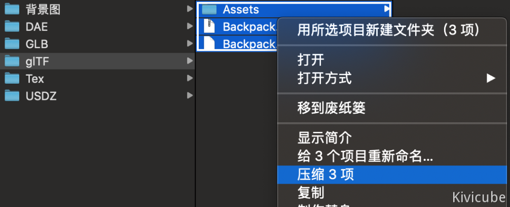 | Step 2: Compress the files to .zip | GLB Format Example: Upload the file directly, no compression is required. GLTF Format Example: