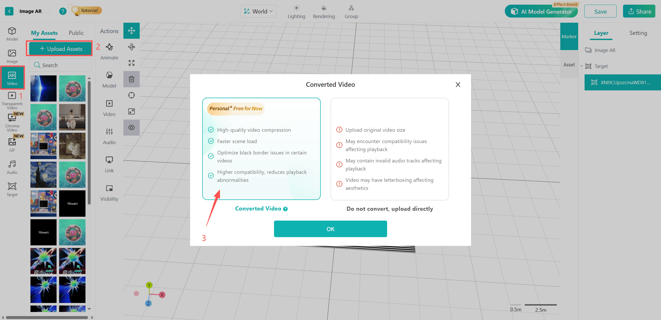| 2 | High compatibility to prevent playback failures or unexpected behavior | Kivicube performs compatibility processing on videos to prevent issues such as playback failure, missing visuals, missing audio, or stuttering on web platforms or WeChat Mini Programs. |