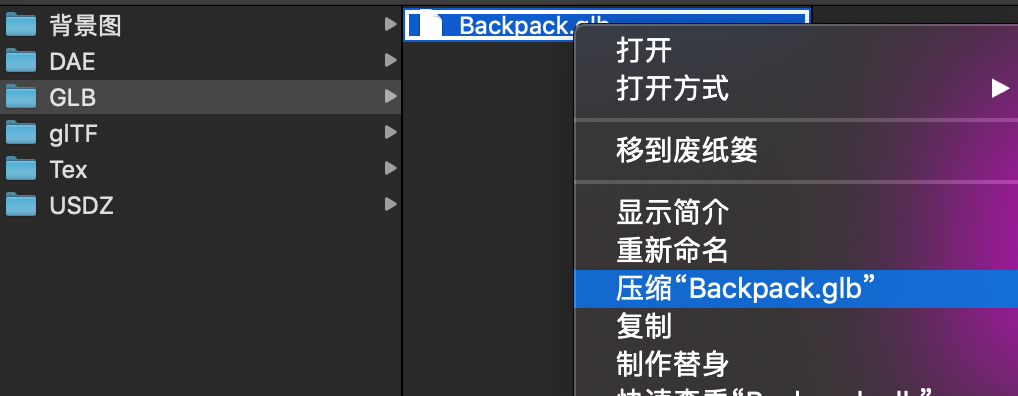 针对fbx文件,需要将fbx文件与贴图文件打包压缩成zip上传;针对gltf文件,需要将将.gltf, .bin与__贴图文件压缩成zip上传;针对glb文件,直接将glb压缩成zip上传;针对obj文件,需要将.obj、.mtl、贴图文件压缩成zip上传,请参考下图: