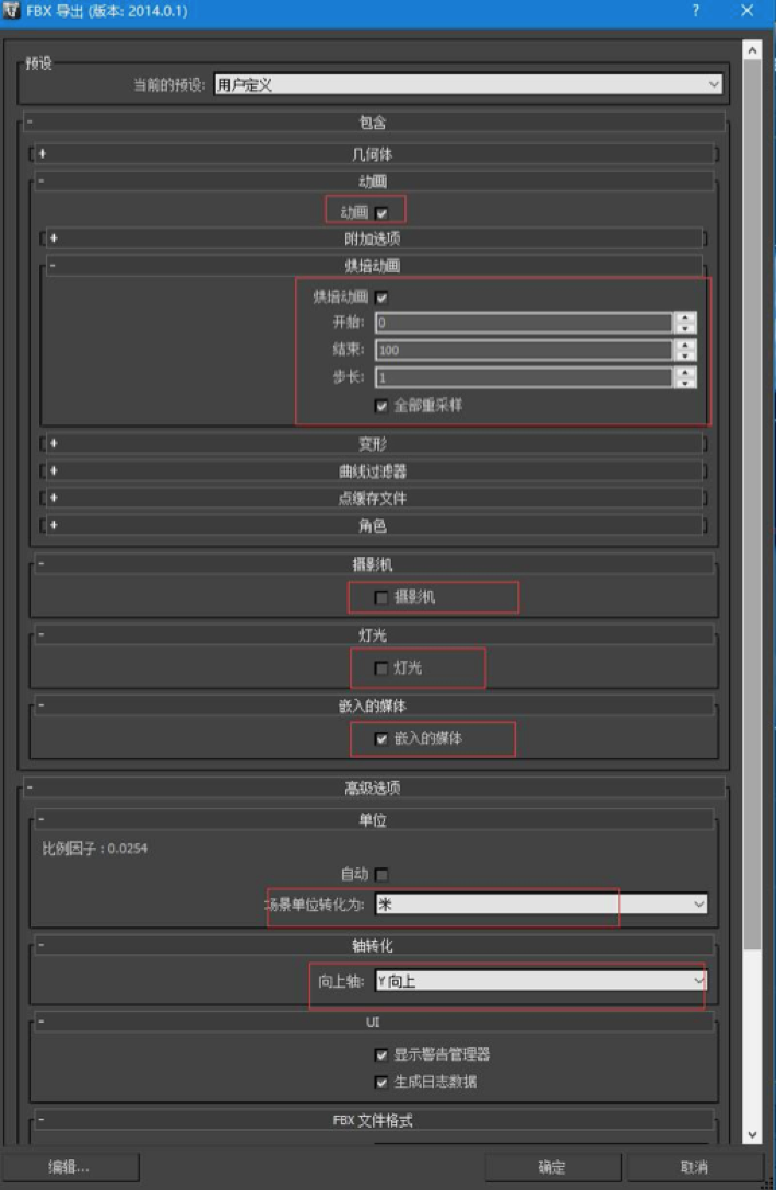 (b)烘焙动画选项,建议制作者先不勾选再导出FBX(减小FBX文件的大小),然后放到场景中测试,如果模型动画显示不正确再勾选导出;