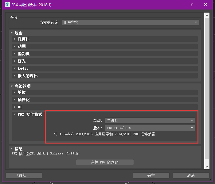 (c)FBX文件格式选择“二进制”和“FBX2014/2015”