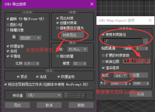 注意:选择材质导出的时候,需要选择OBJ所在的文件夹路径;