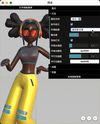 | macOS版 | 可以设置一盏灯光,建议与程序的灯光一致,进行效果模拟 | + 默认纯白色 + 强度0.3 | + 可以自己设置环境贴图 + 注意:这里面的环境贴图是hdr格式,会显得亮一些 |