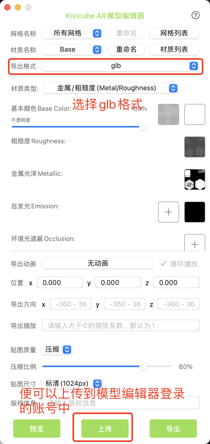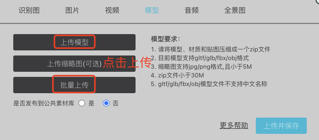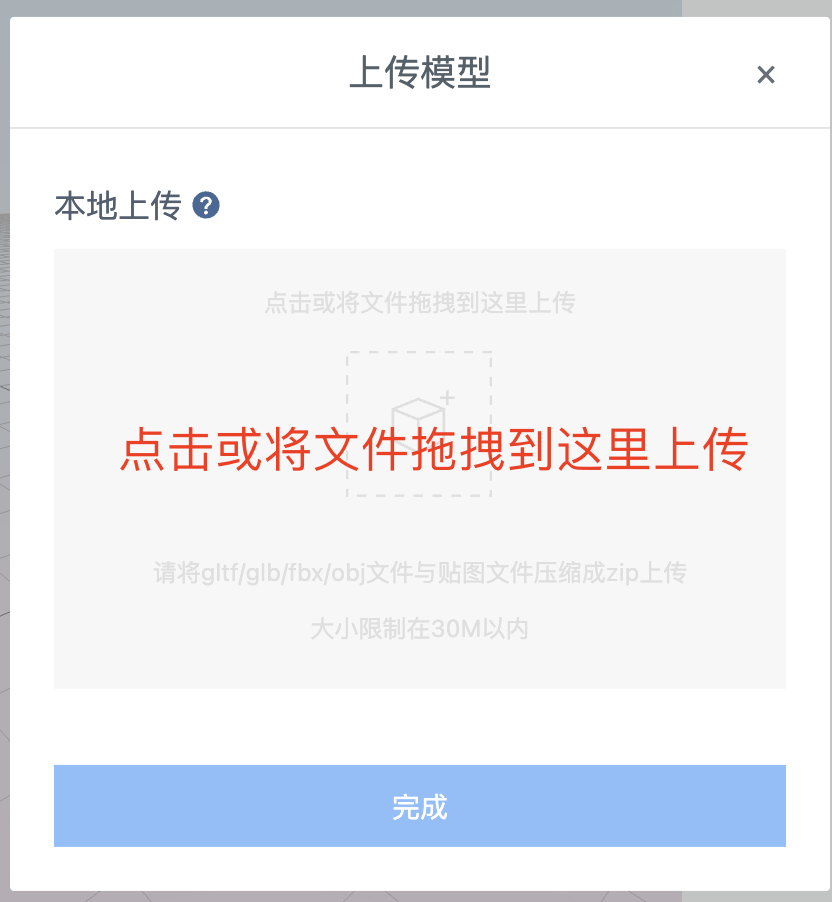 | 第一步: 准备模型文件 | + 平台支持glb、gltf、fbx、obj格式上传,但是强烈建议是glb格式 |