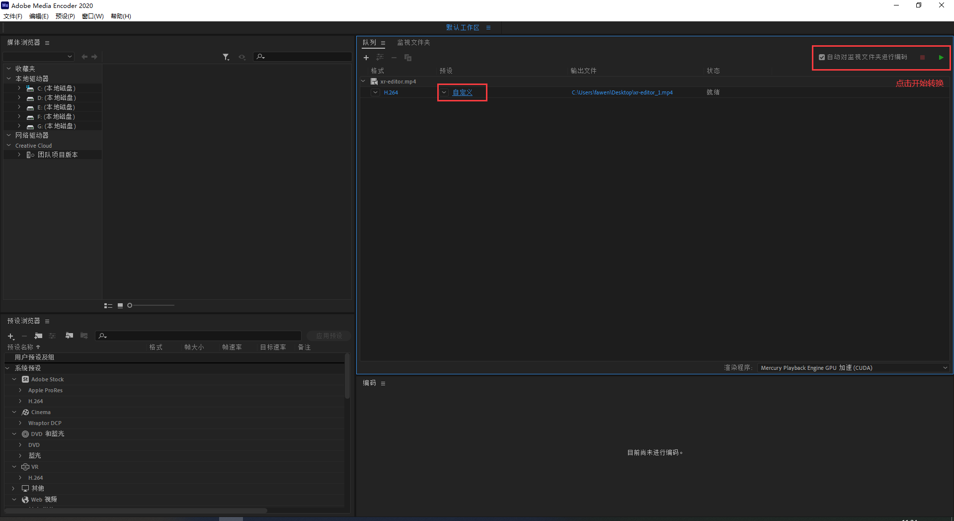 设置完成后,预设这里会显示为“自定义”,点击右上角按钮开始转换,转换成功后,视频文件户显示在您设置的路径下。