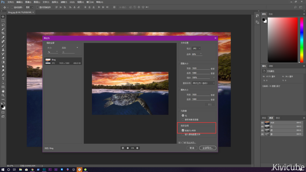 ![]() 导出图片文件时一定需要勾选“色彩空间” - “转换为sRGB”,导出文件后检查图片是否存在色差 | |