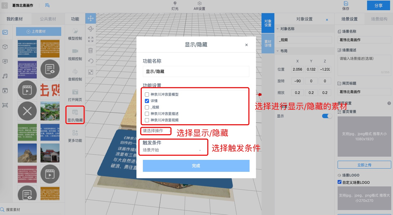 所有素材拖入画布时都是默认为显示。