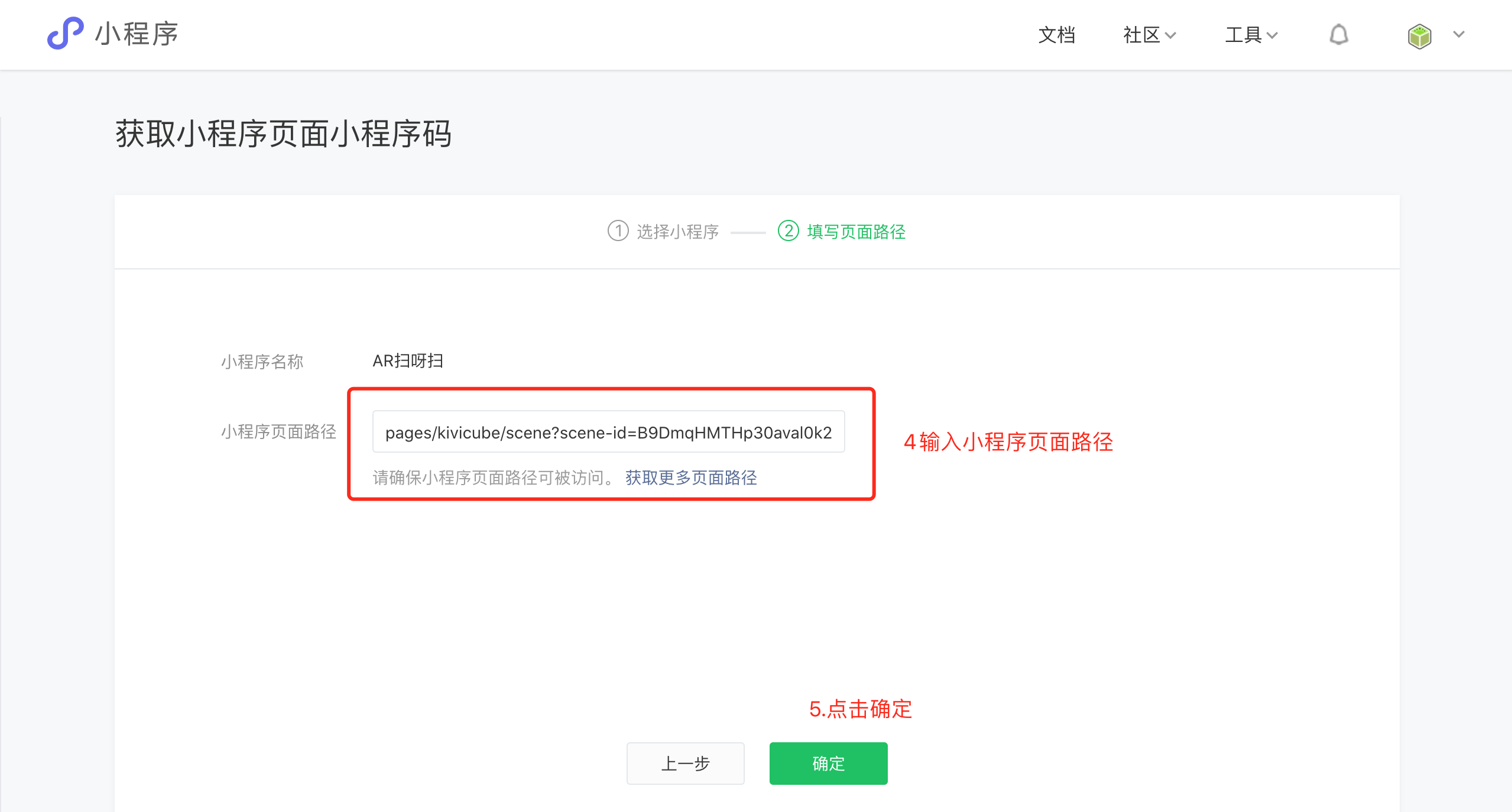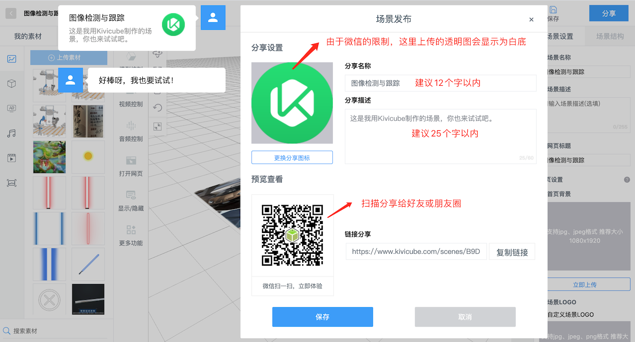 在Kivicube编辑器中的分享弹窗获得分享链接,如:https://www.kivicube.com/scenes/B9DmqHMTHp30aval0k28wWYmAxzYJ5WM,那么对于的小程序路径为:pages/kivicube/scene?scene-id=B9DmqHMTHp30aval0k28wWYmAxzYJ5WM