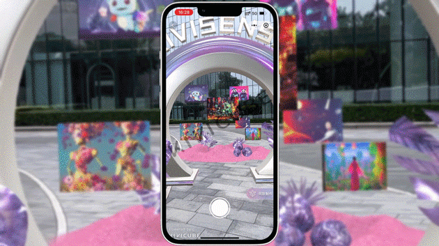 使用平面AR能力,将展示有多幅AI画作的虚拟博物馆摆放在现实空间中。观众可以通过位移和转动镜头想象自己漫步在博物馆的展览室中,从任意角度、细节欣赏这些作品,感受艺术与科技的融合。