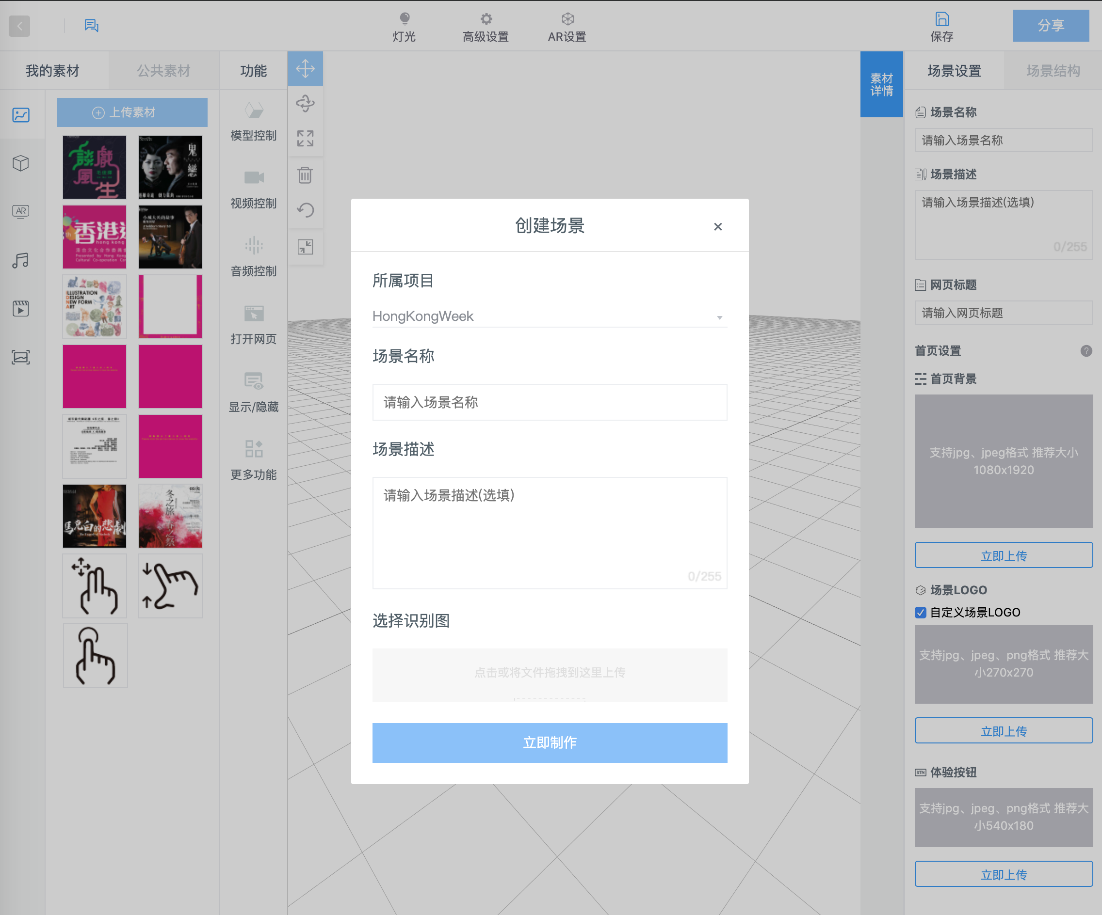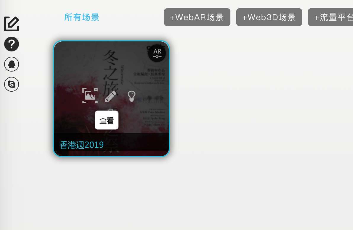 - 根据项目情况在“+WebAR场景”,“+Web3D场景”与“+流量平台AR场景”中进行选择,有跟踪的WebAR场景请选择“+WebAR场景”。