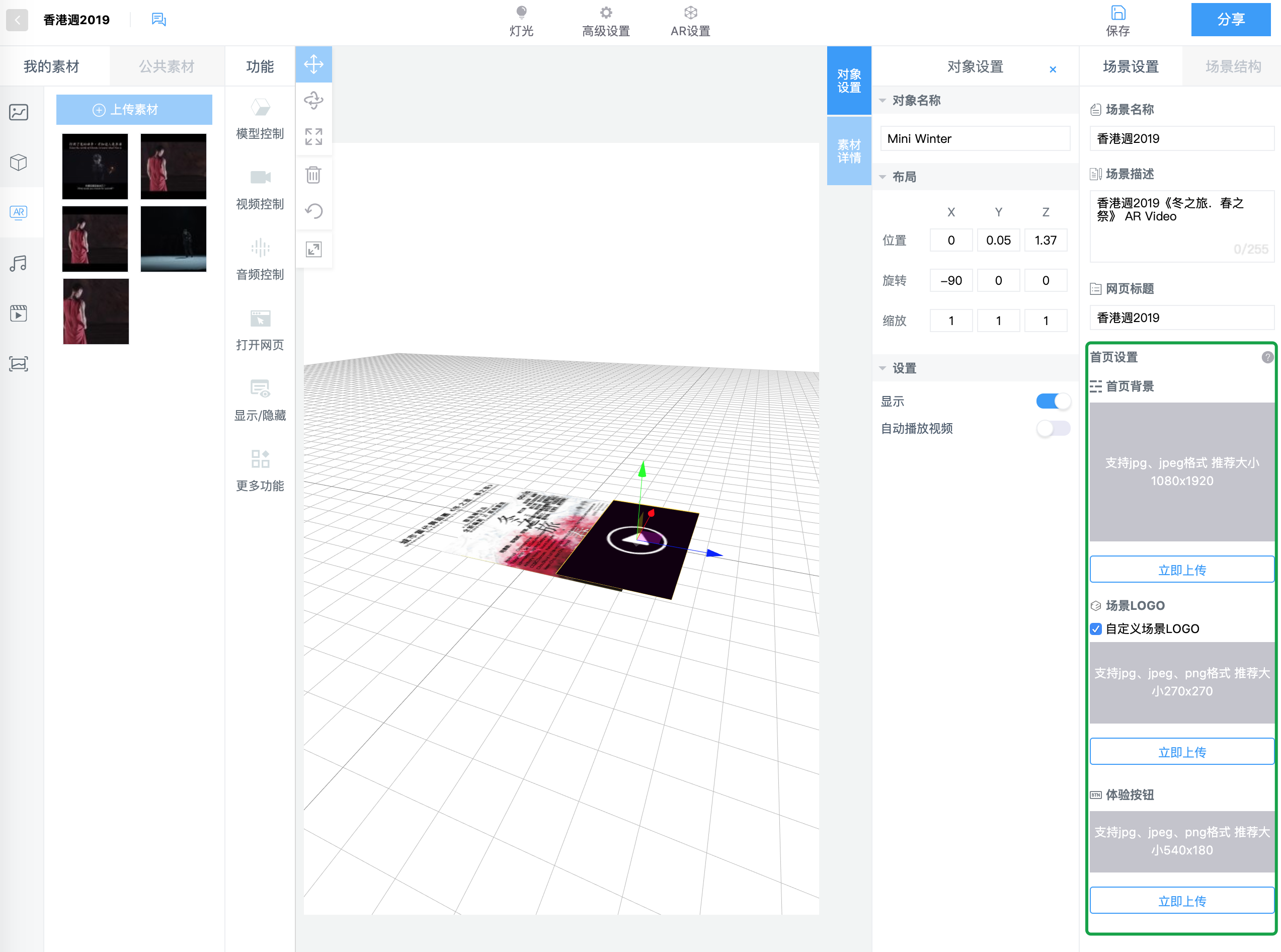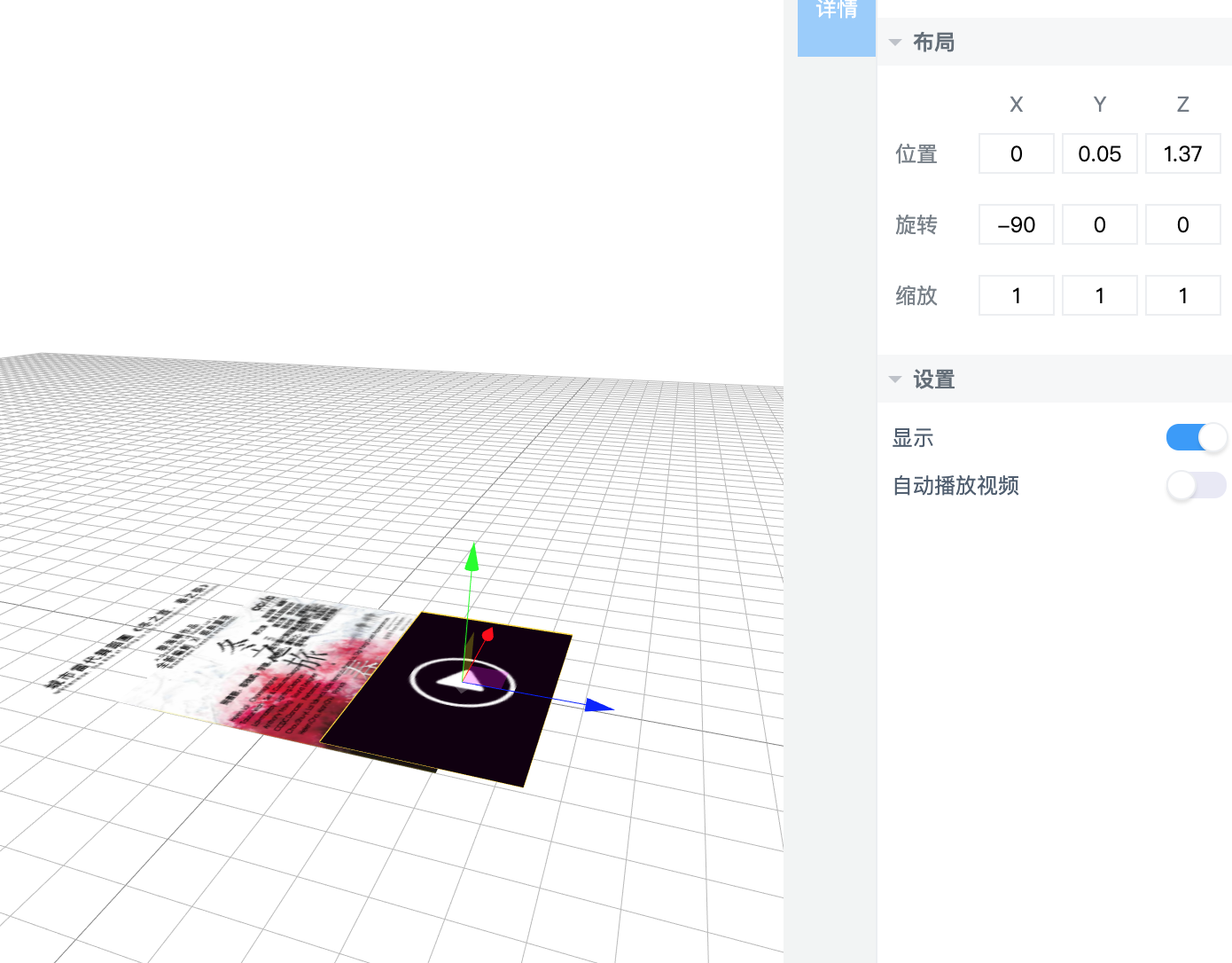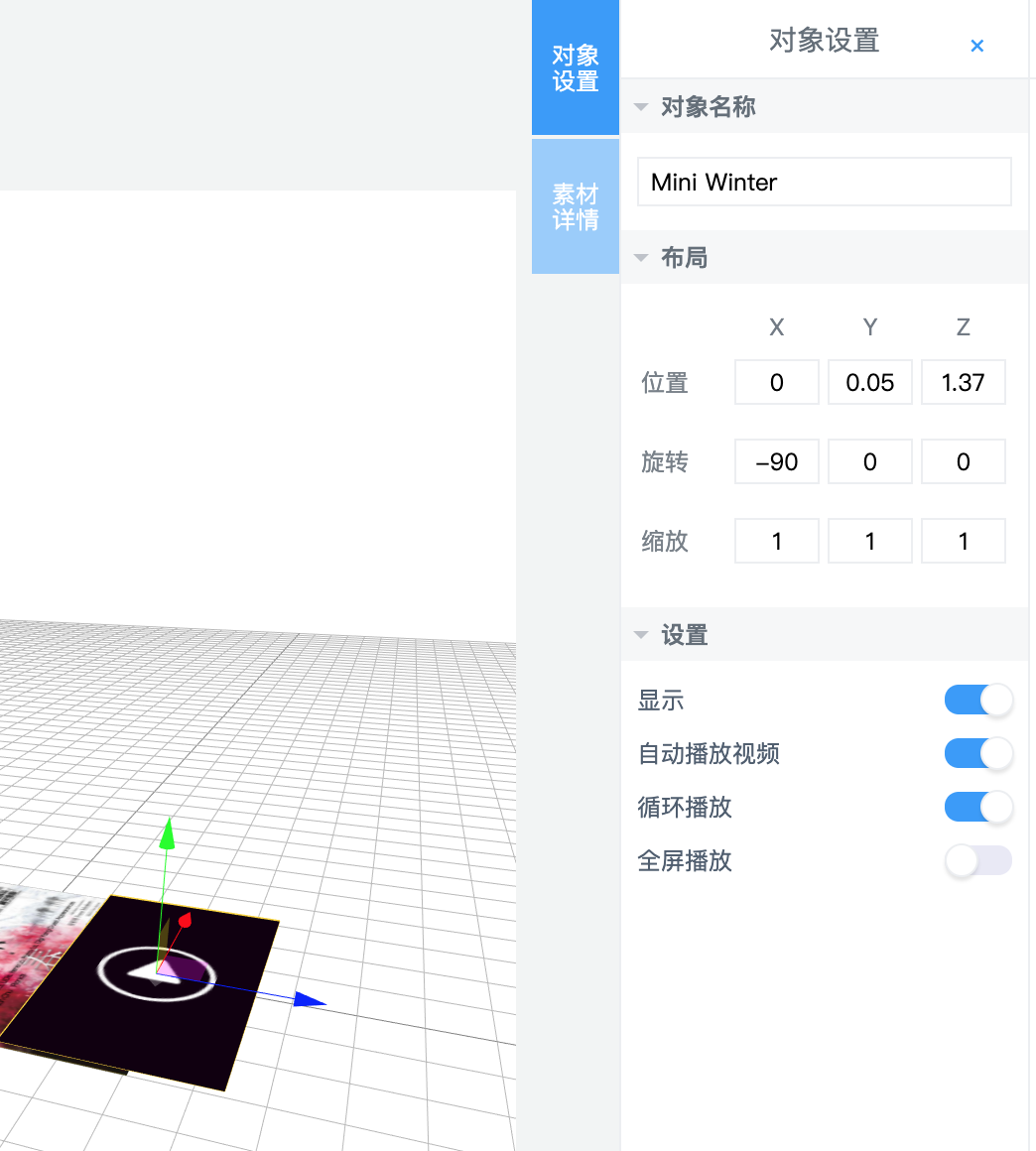 - 注意若有点击事件等交互的话,一定要注意不要让被点击的物体被其他物体所遮挡。因此图层上而言,可以将视频微微上移一些。即Y轴的调整,从之前的0.01调整为0.05。