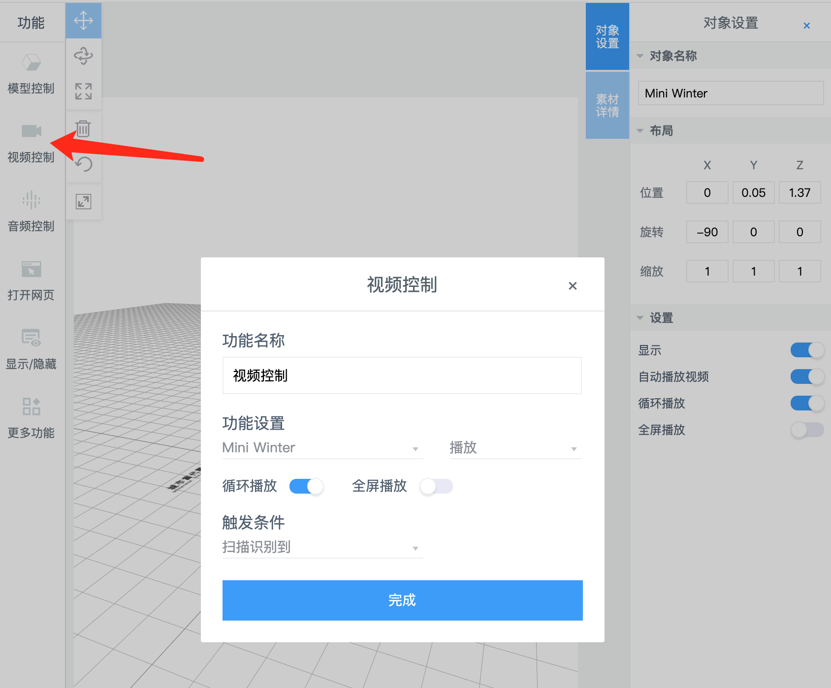 - 添加交互事件,若用户希望视频已扫描图片就进行播放的话,直接勾选“自动播放视频”或者在左侧的“视频控制”中进行设置。