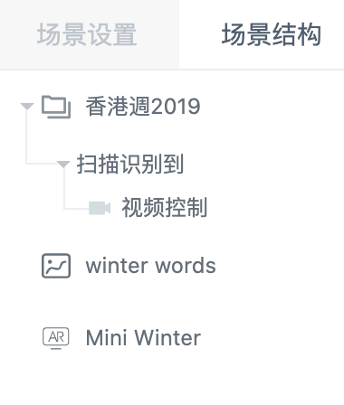 所有事件和制作的场景元素都会在“场景结构”中进行体验,当整个场景内容非常多的时候,可以通过点击场景结构中的节点来“选择”AR素材。