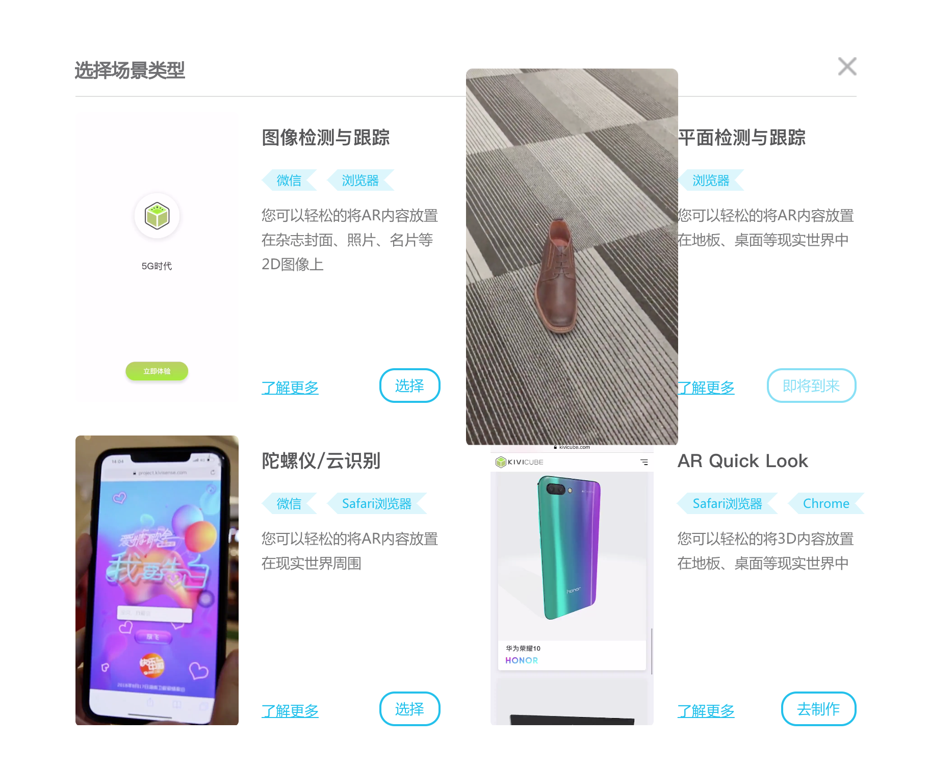 - 点击“+WebAR场景”之后,会出现细节场景类型,需要实时的图像跟踪的话,请选择“图像检测与跟踪”<!-- 这是一张图片,ocr 内容为: -->