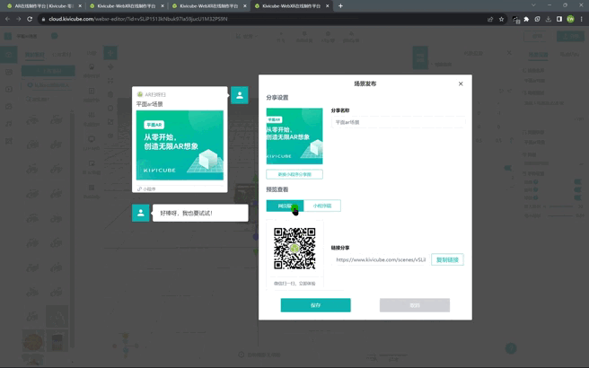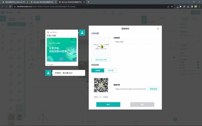 保存完场景后我们可以对场景进行分享设置,点击分享按钮,可以自定义分享图标、分享icon;还可以为链接添加分享icon,以及设置分享名称和相关的描述,最终会以下图对话框中的形式展现出来: