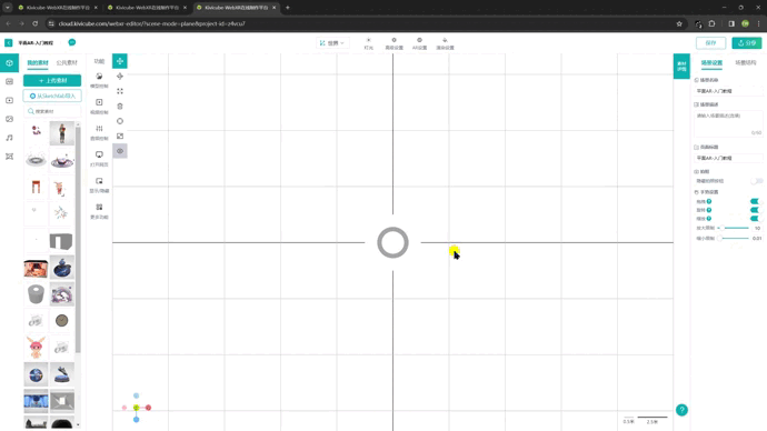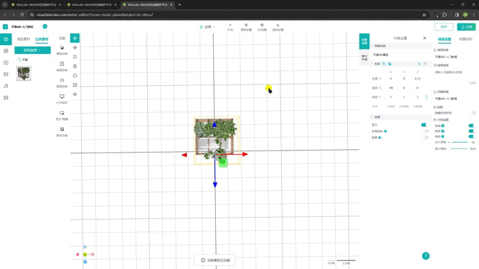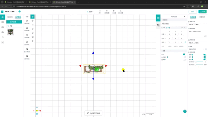 场景创建好后,点击页面左侧的模型→公共素材→搜索平面ar模型,将其拖拽入场景内