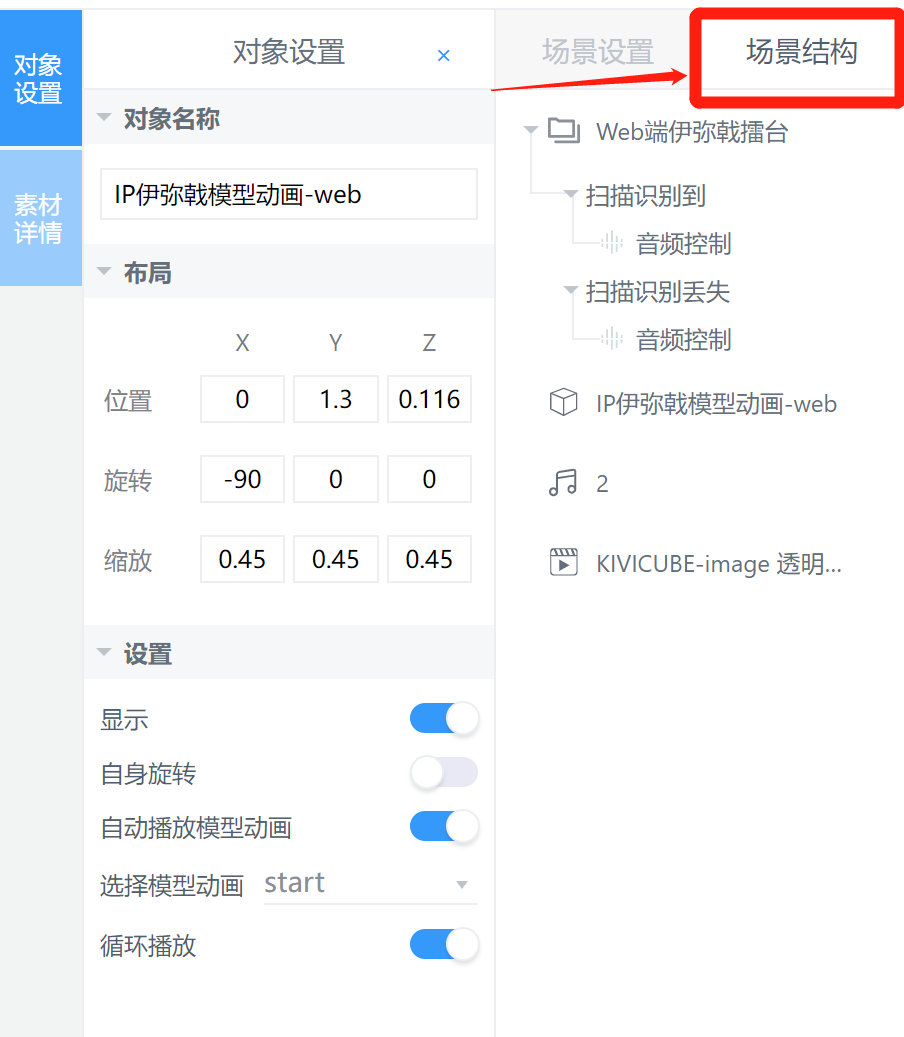 | A | 1. 确保自己没有播放的多个模型动画:在kivicube平台编辑器内点击【场景结构】查看场景内问题模型的交互事件,确保没有同时播放多个模型动画 |