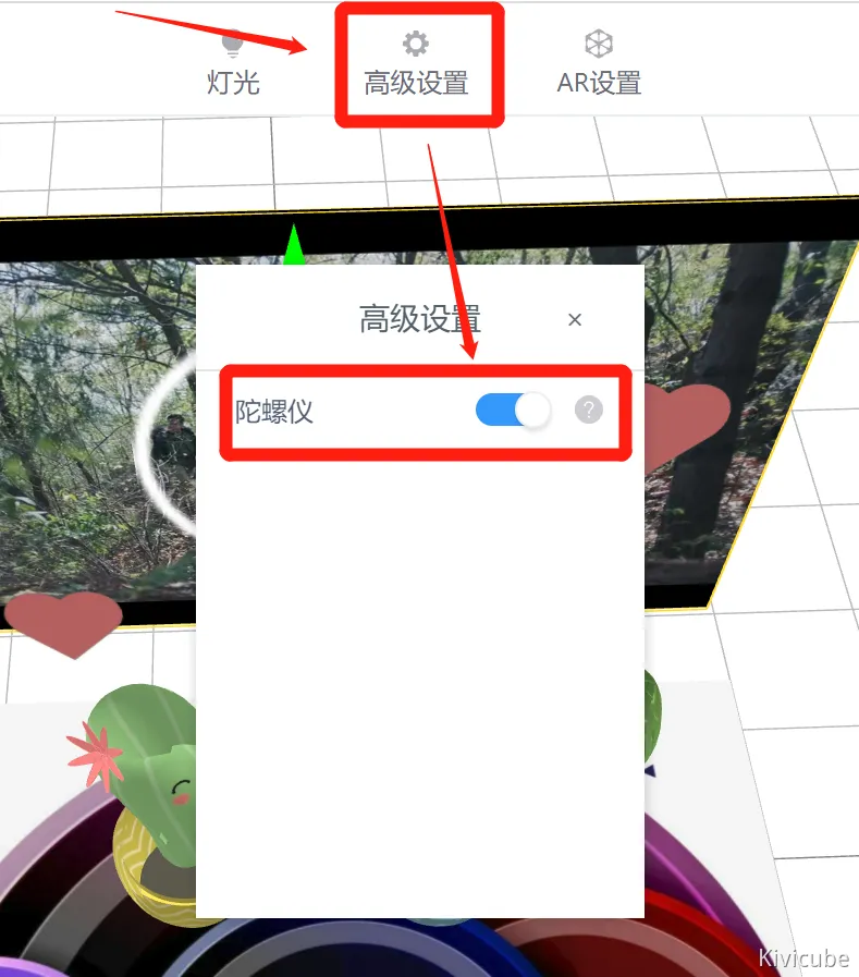 打开Kivicube平台编辑器【图像检测与跟踪场景】点击上方【高级设置】,打开【陀螺仪】功能即可