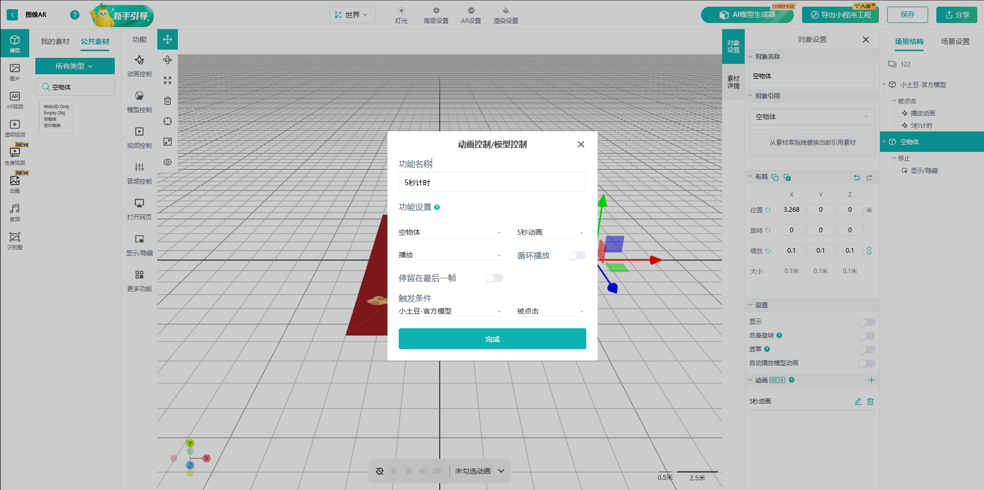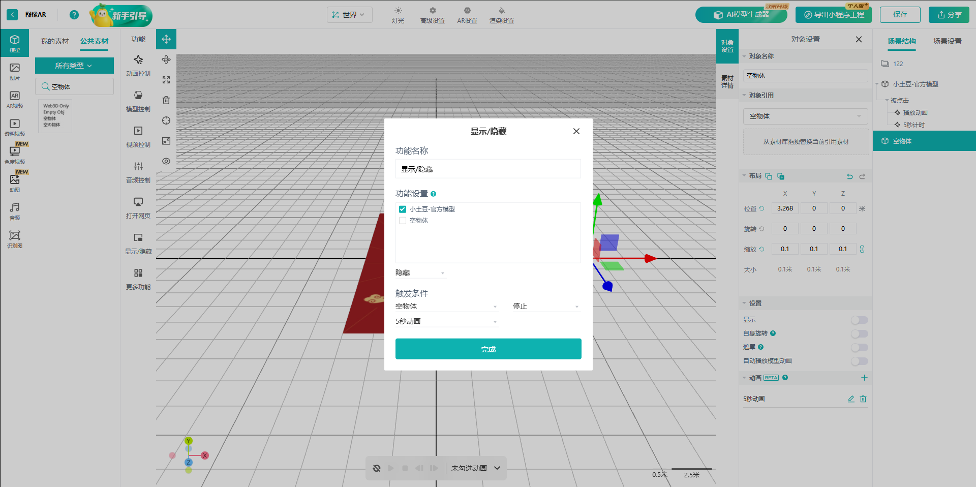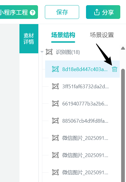 如果需要删除识别图,可以在场景编辑界面右侧的场景结构-识别图中直接点击删除按钮(场景中最少需要存在一张识别图)