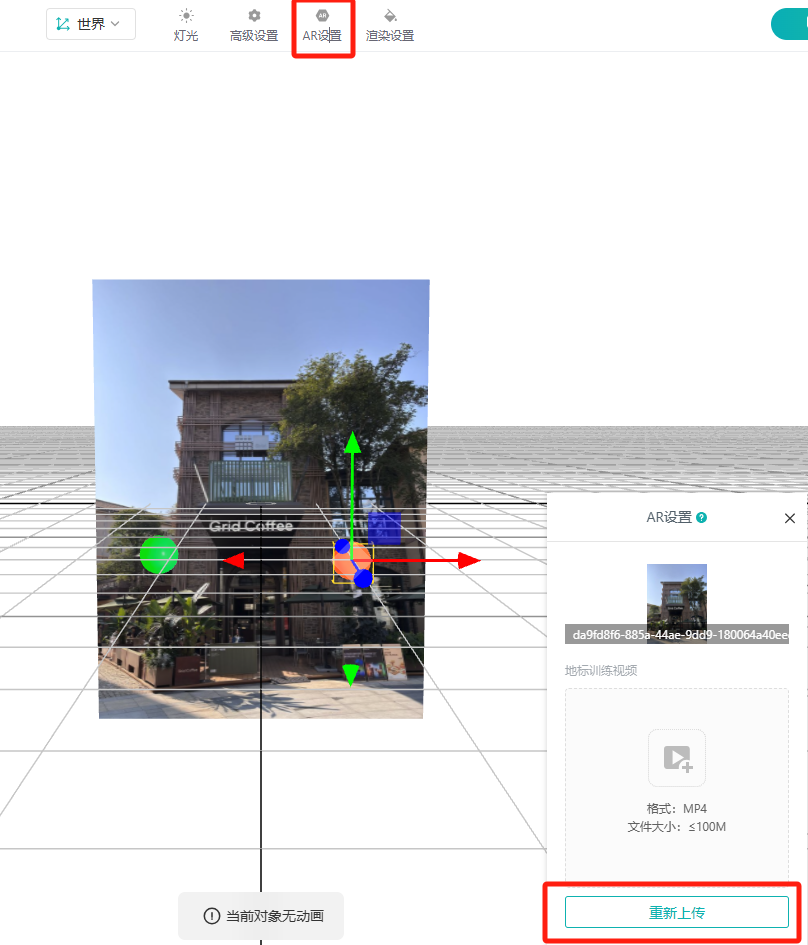 在场景编辑界面点击上方【AR设置】中的【重新上传】即可更换定位视频