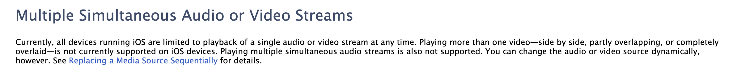 iOS设备上,由于系统限制,场景里无法播放多个音频、视频的,以下为官方说明截图