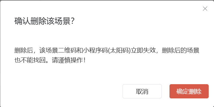 二维码与场景绑定,删除场景会导致二维码或小程序码失效,删除场景前系统会明确提示,请谨慎操作