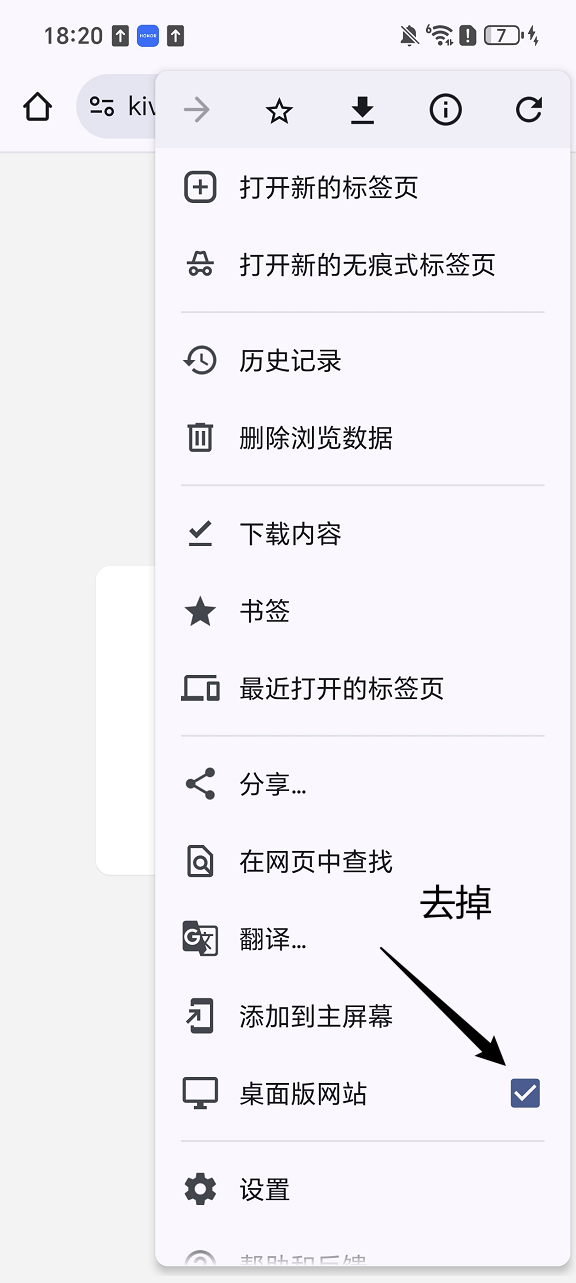 需要在浏览器中关闭【电脑版网站】或【桌面版网站】功能。
