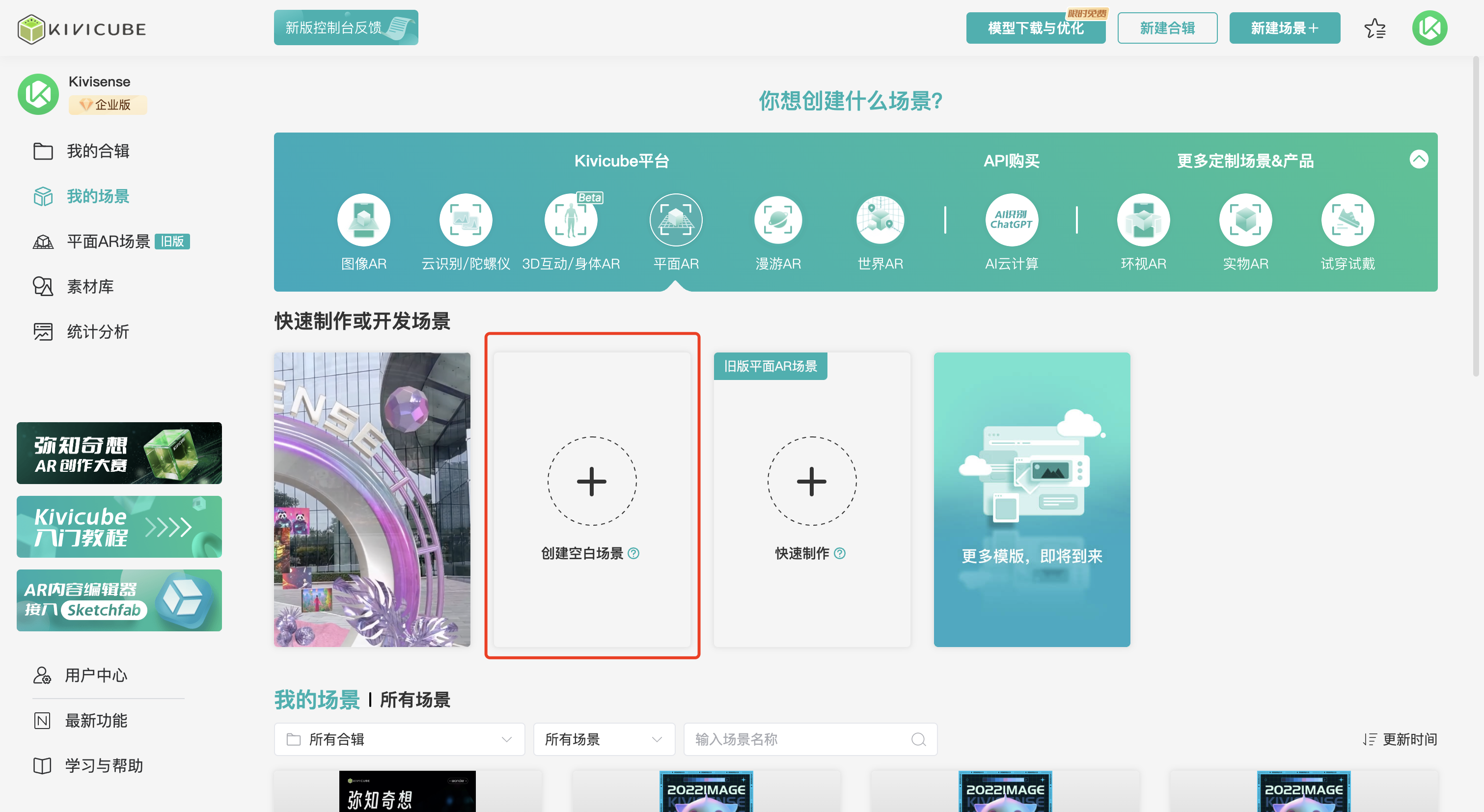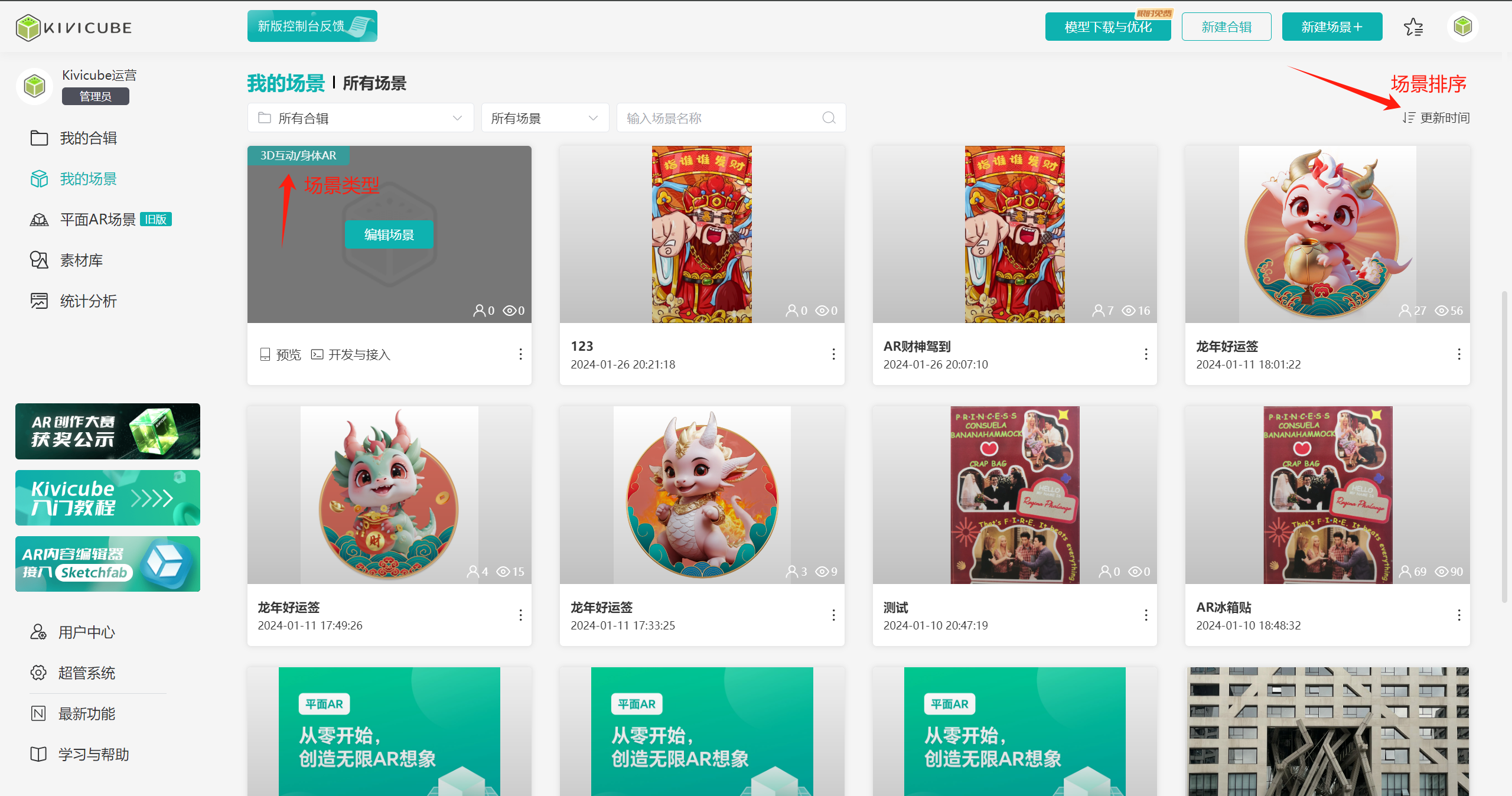 点击“我的场景”可以查看已成功创建的场景。鼠标移到场景上后,可以显示该场景的类型,同时可以对所有场景进行分类、排序显示。需要注意的是,这里展示的AR场景类型并不包含平面AR场景(旧版)。