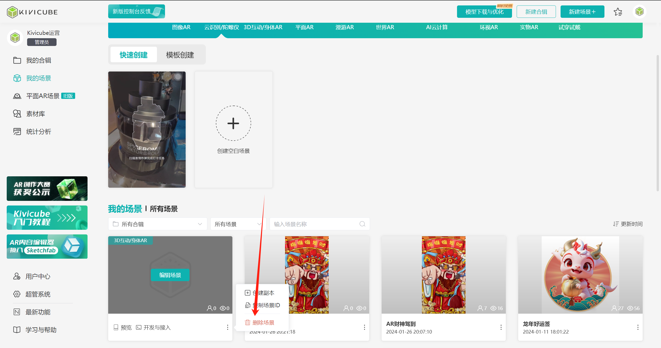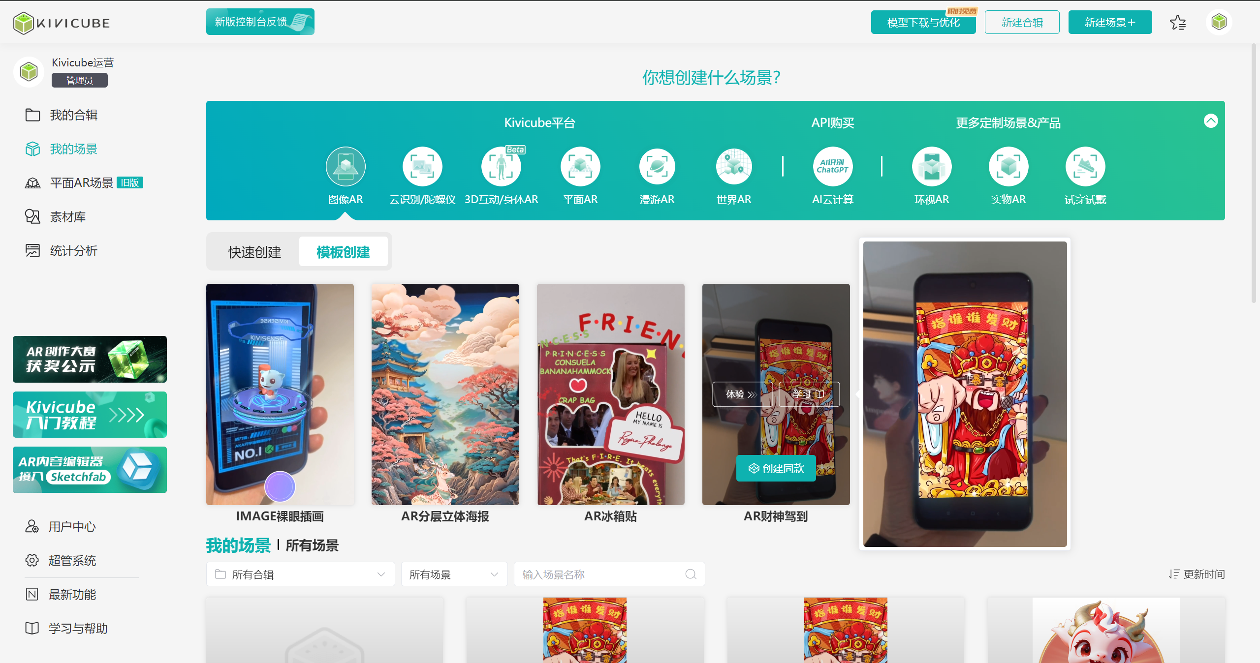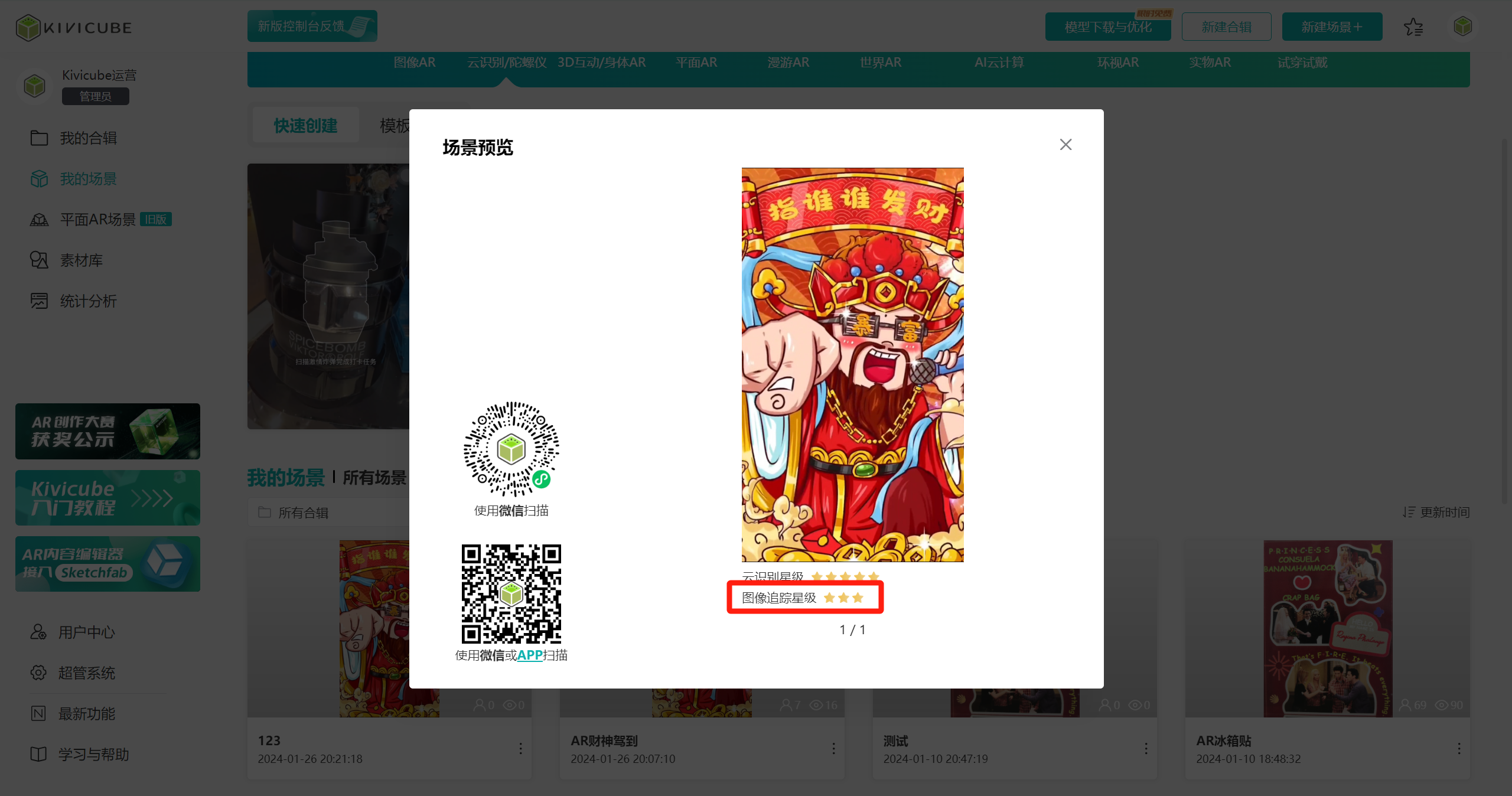 用户通过管理控制台可以创建多个不同AR类型的场景,并可对各个所有类型的场景进行编辑、删除、预览、查看。