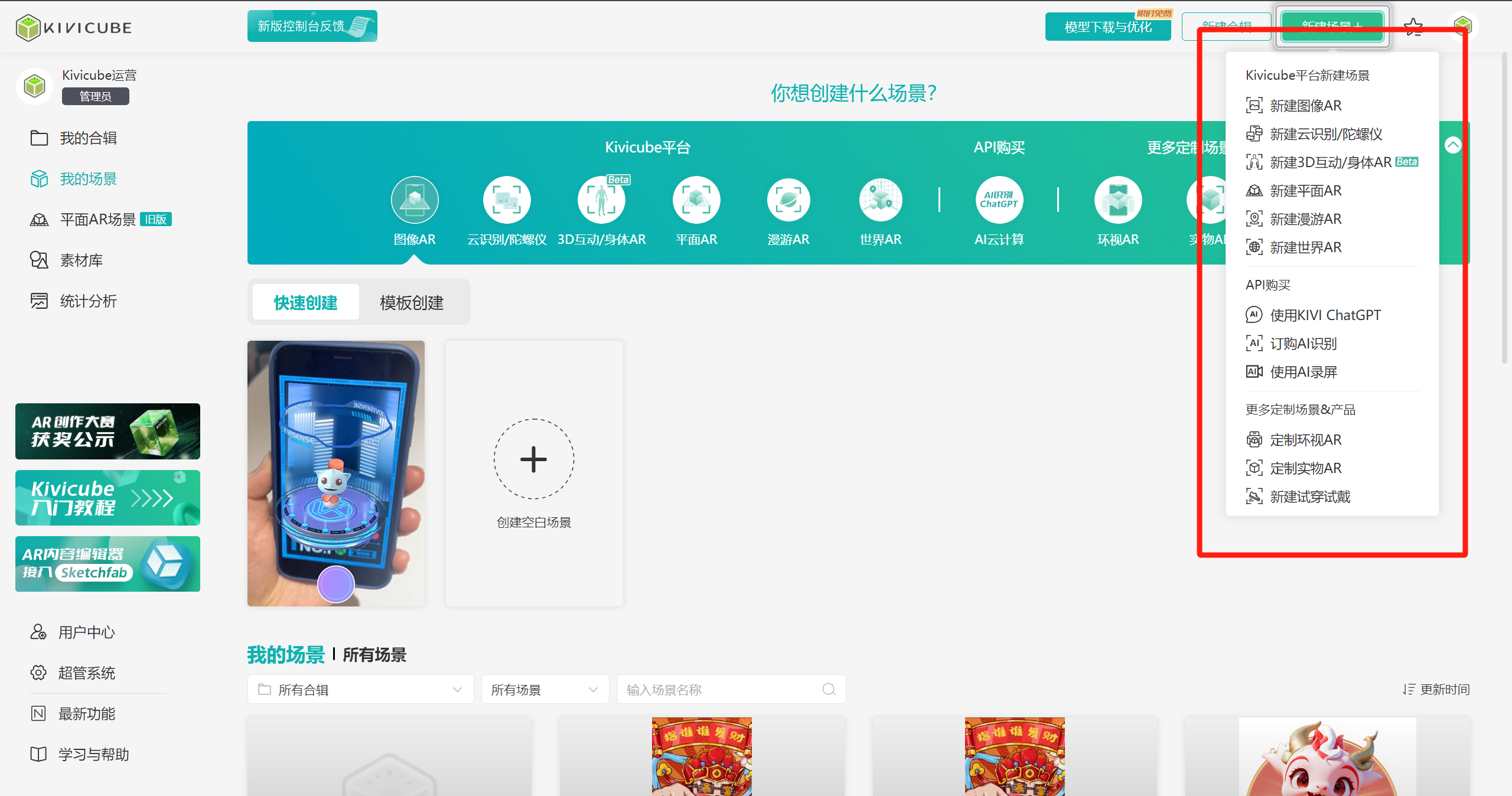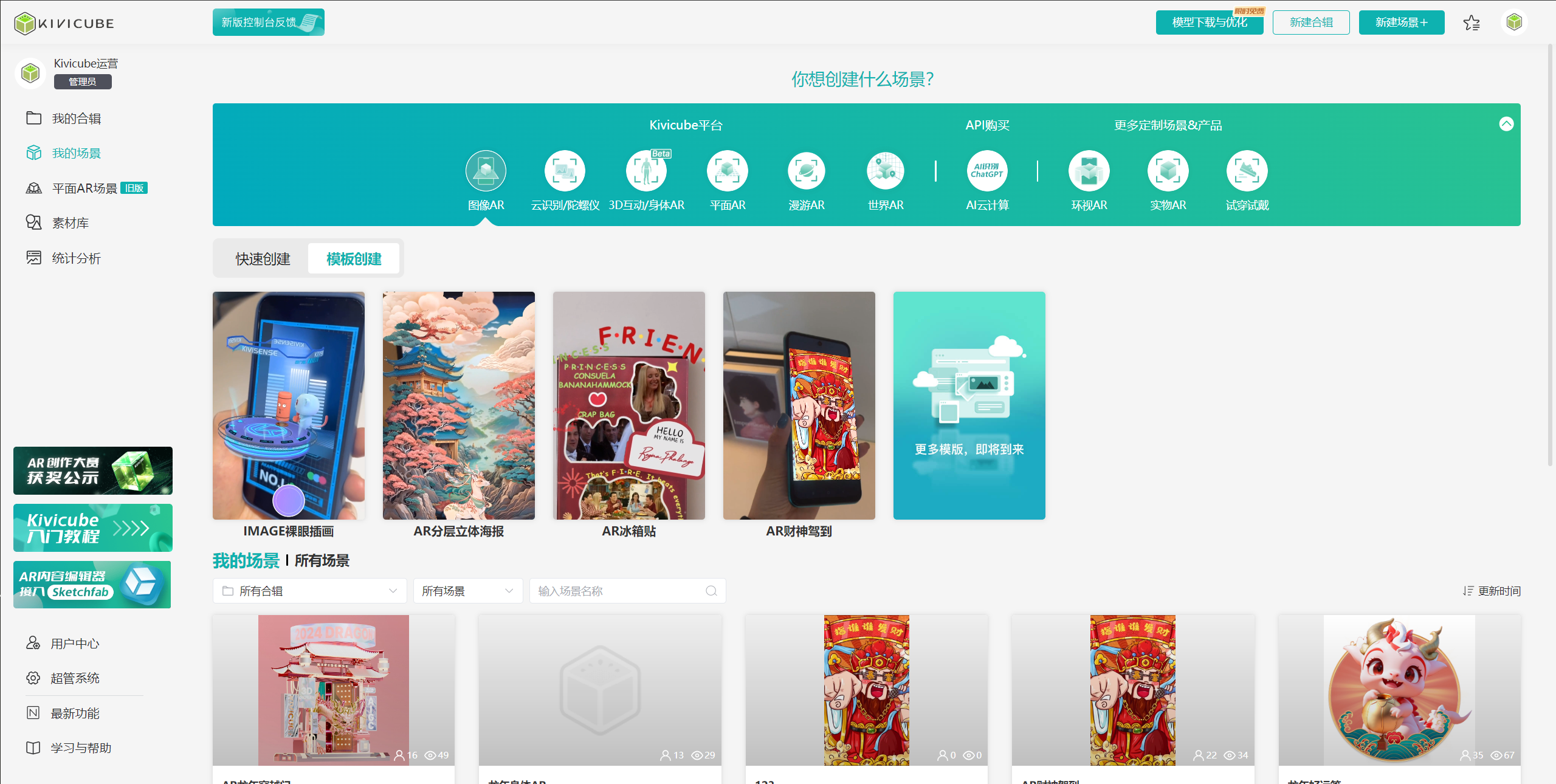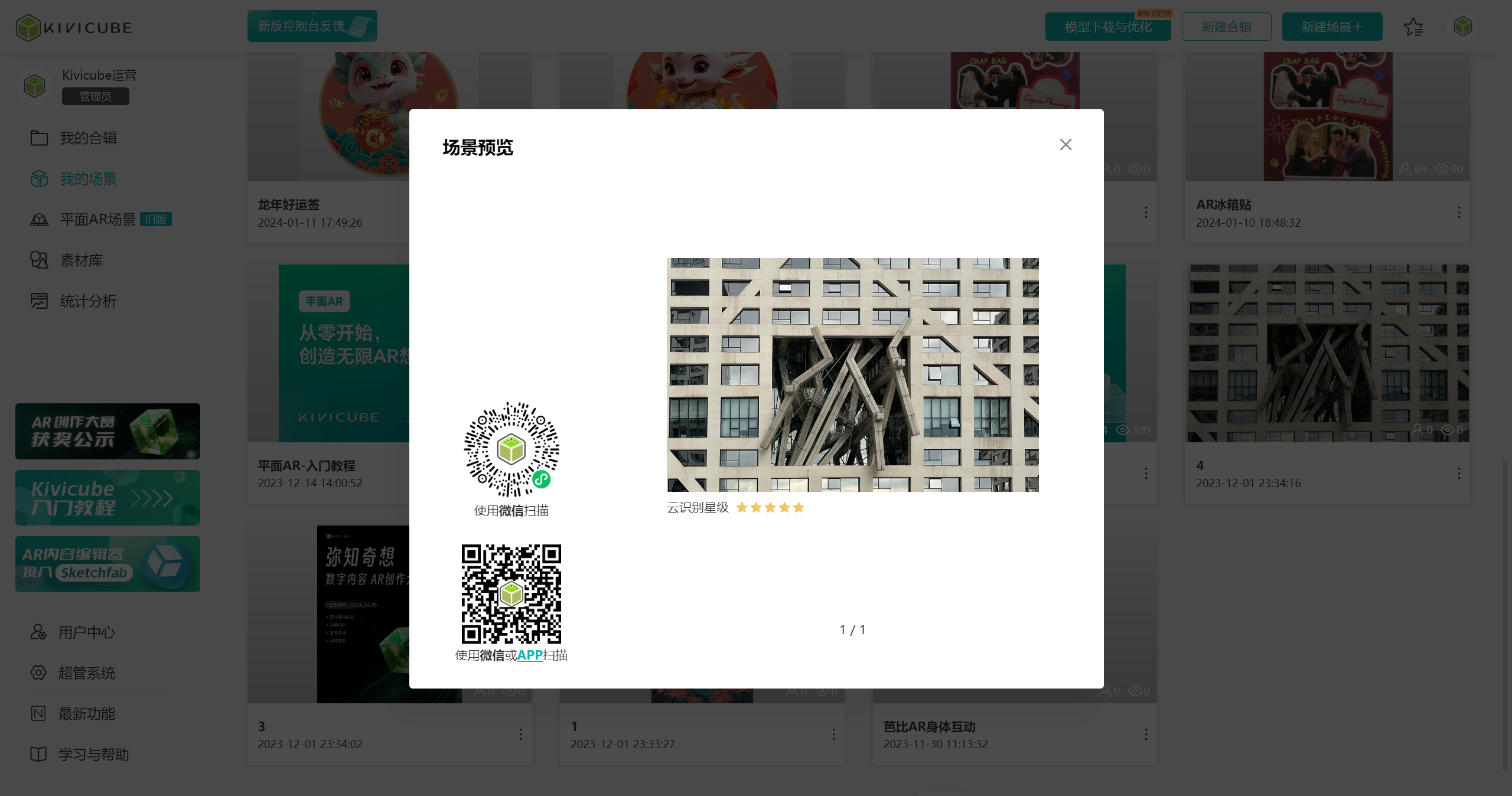 用户通过管理控制台可以创建多个不同AR类型的场景,并可对各个所有类型的场景进行编辑、删除、预览、查看。