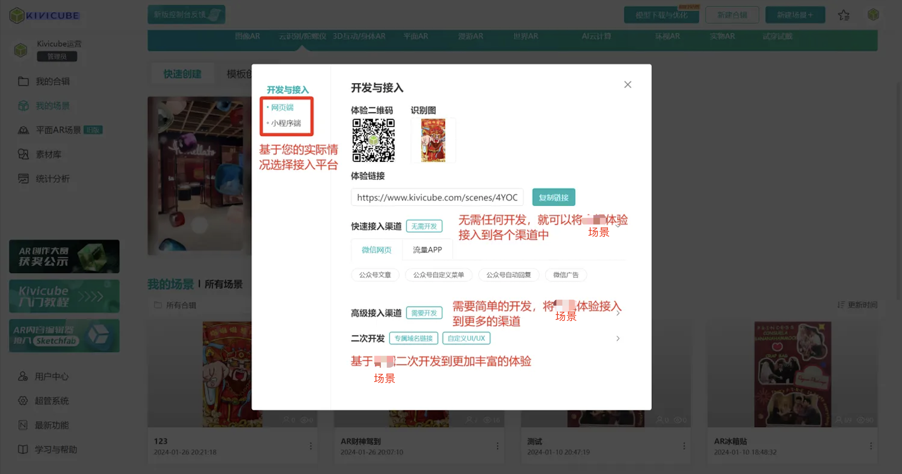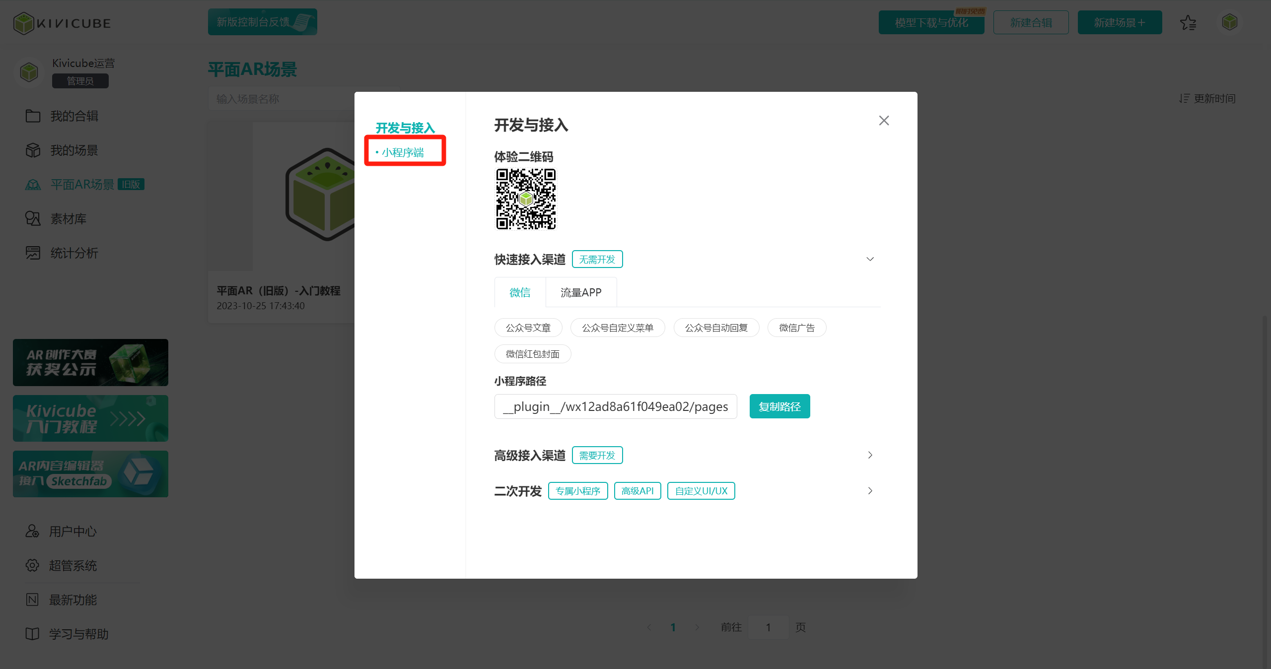 用户选中对应场景后,点击“开发与接入”可以自行根据需求进行开发接入。需要注意的是,旧版平面AR场景并不支持网页端展示,目前能提供的接入方式仅限于微信小程序端。