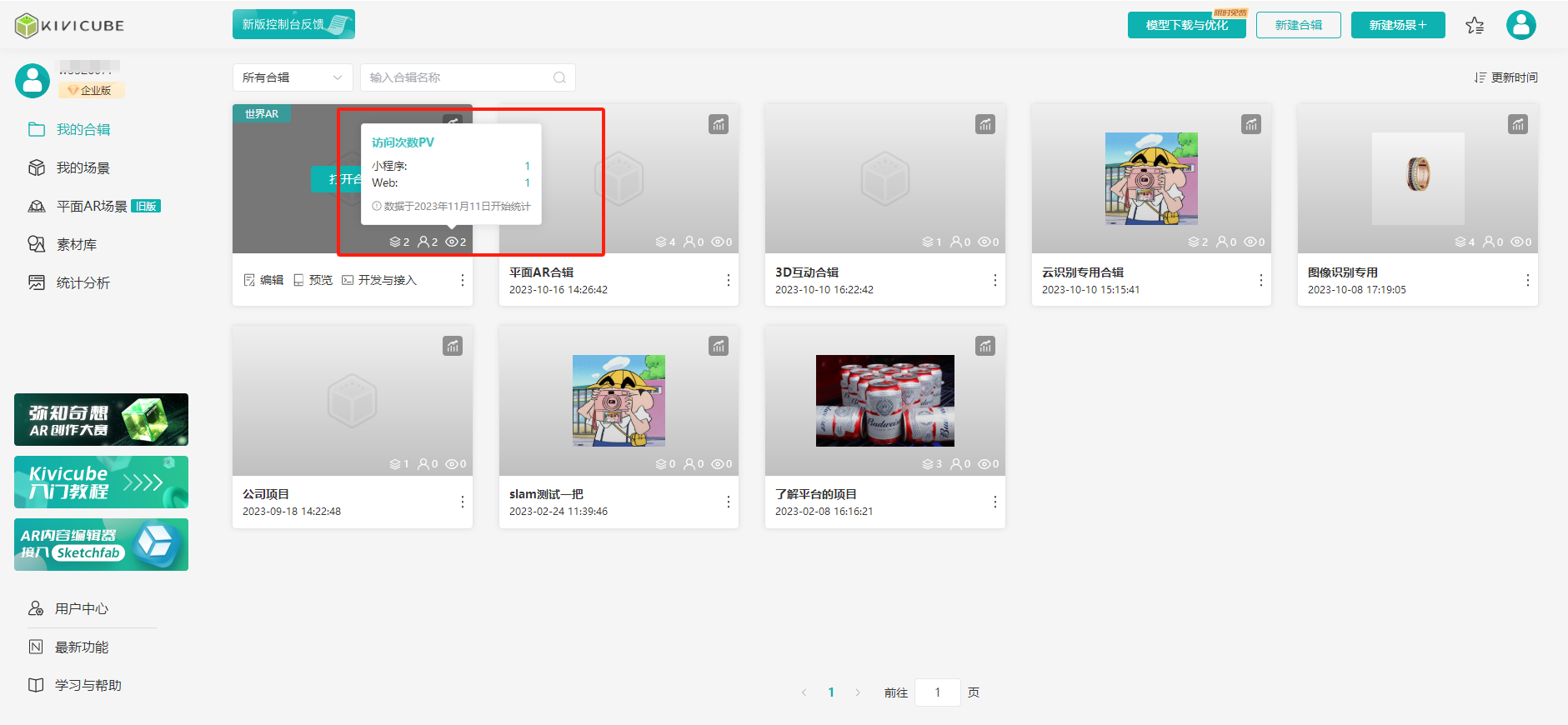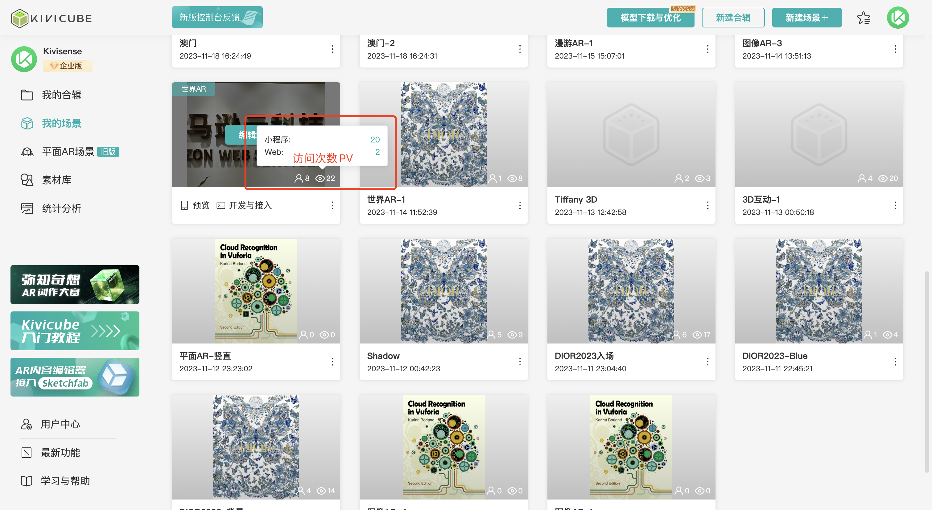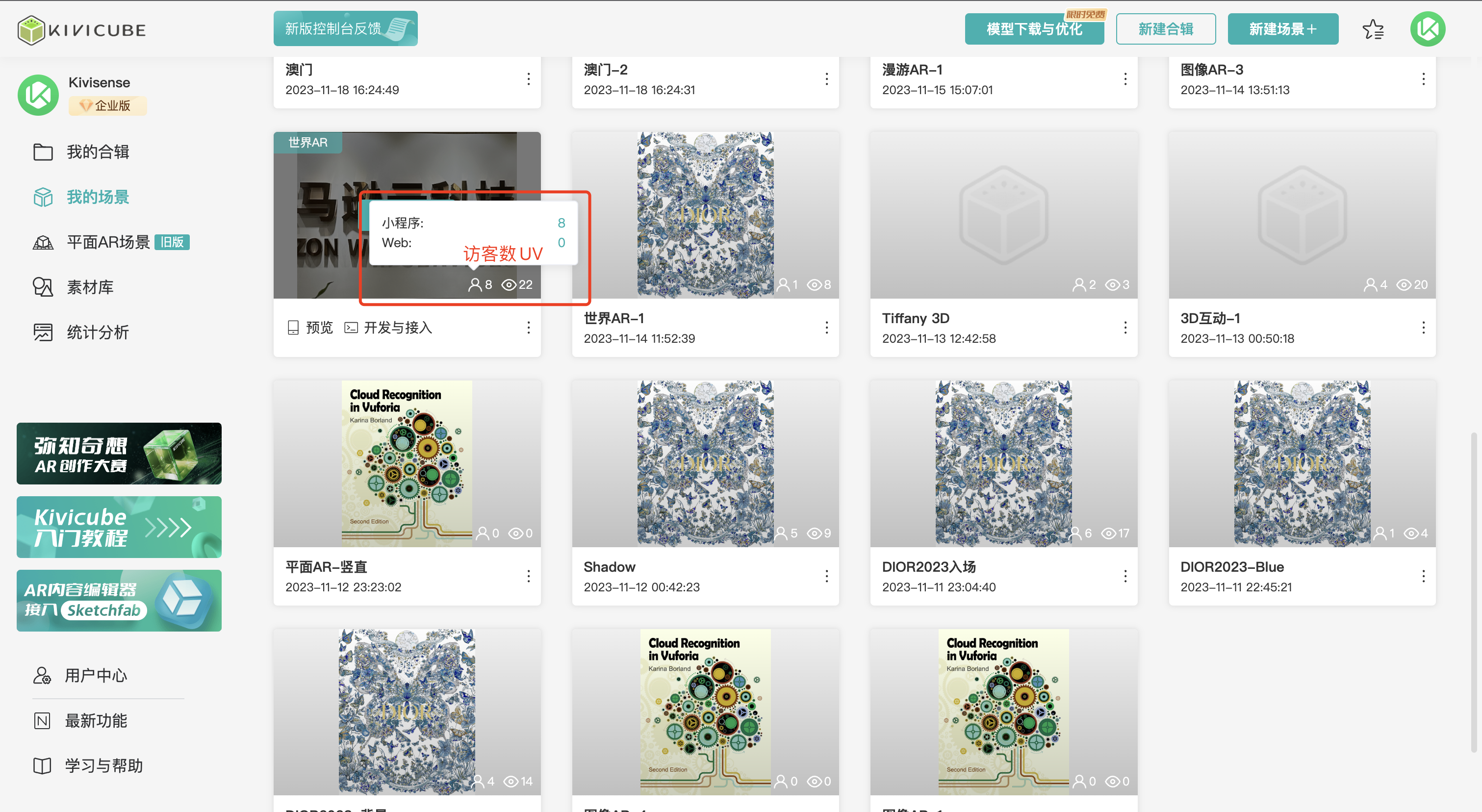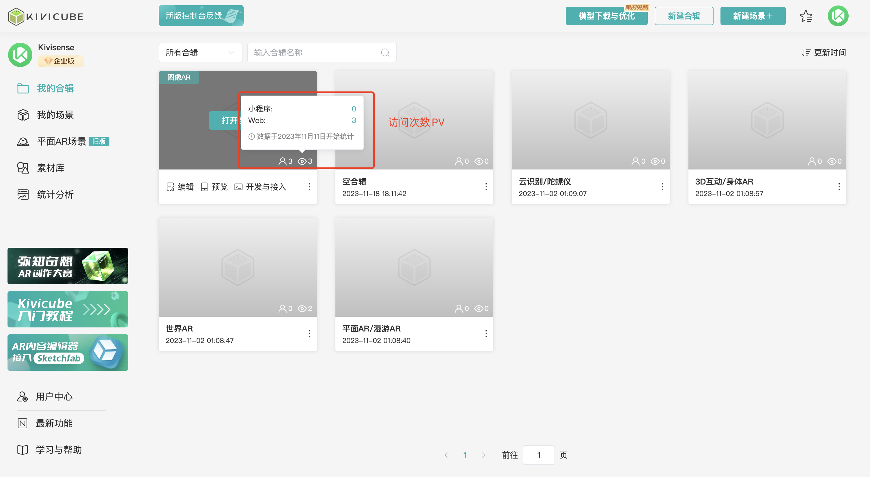针对于用户创建的场景以及合辑,Kivicube平台提供基础统计功能,场景以及合辑对应的访客数UV和访问次数PV都会进行统计展示。