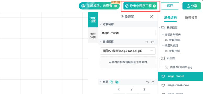 「小程序工程」是用于在小程序开发工具中打开、直接编译和预览AR场景效果的成品包,不可像PSD等设计源文件那样进行二次编辑修改。它可以帮助开发者把场景编辑器导出的小程序demo下载到本地,并在微信开发者工具中成功跑起来。