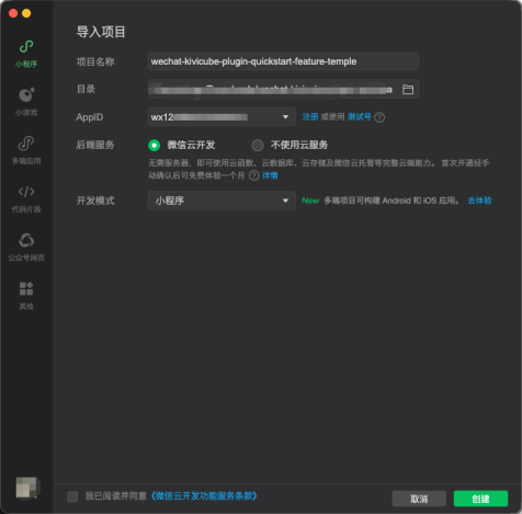 选择刚刚解压后的工程文件夹,填写项目名称和 AppID 等基础信息,然后点击“创建”。项目名称可以自定义,方便你自己识别即可。