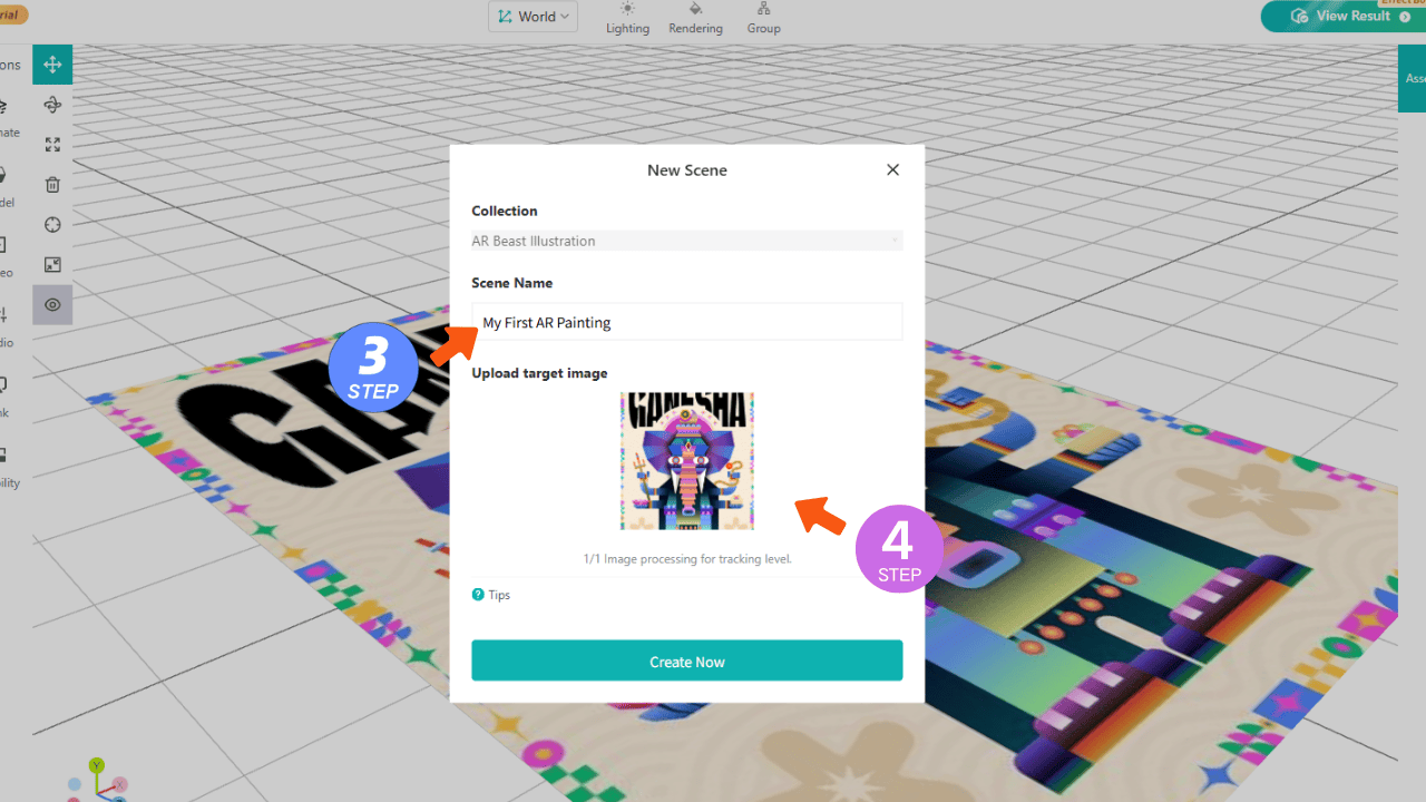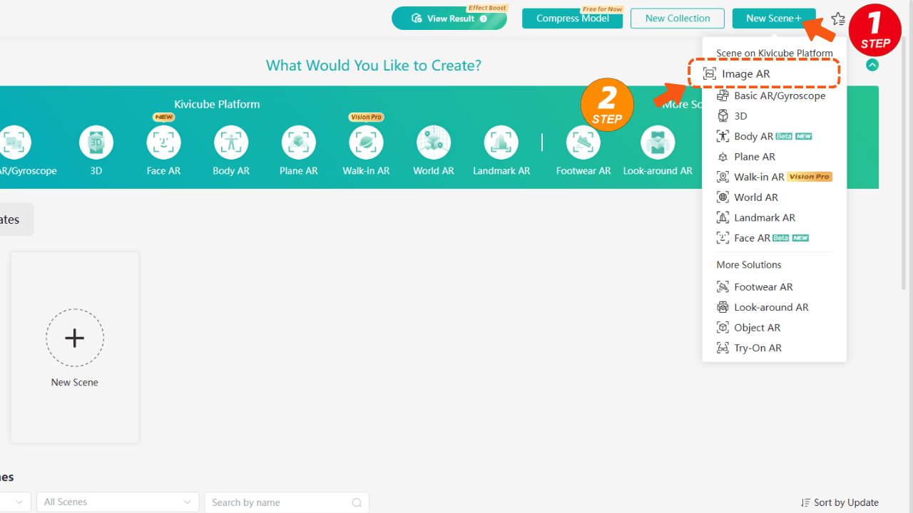 - Sign up for a free Kivicube account. Once logged in, go to your dashboard and click "Create Image AR Scene" in the top right corner, then name your scene (e.g., "My First AR Painting").
