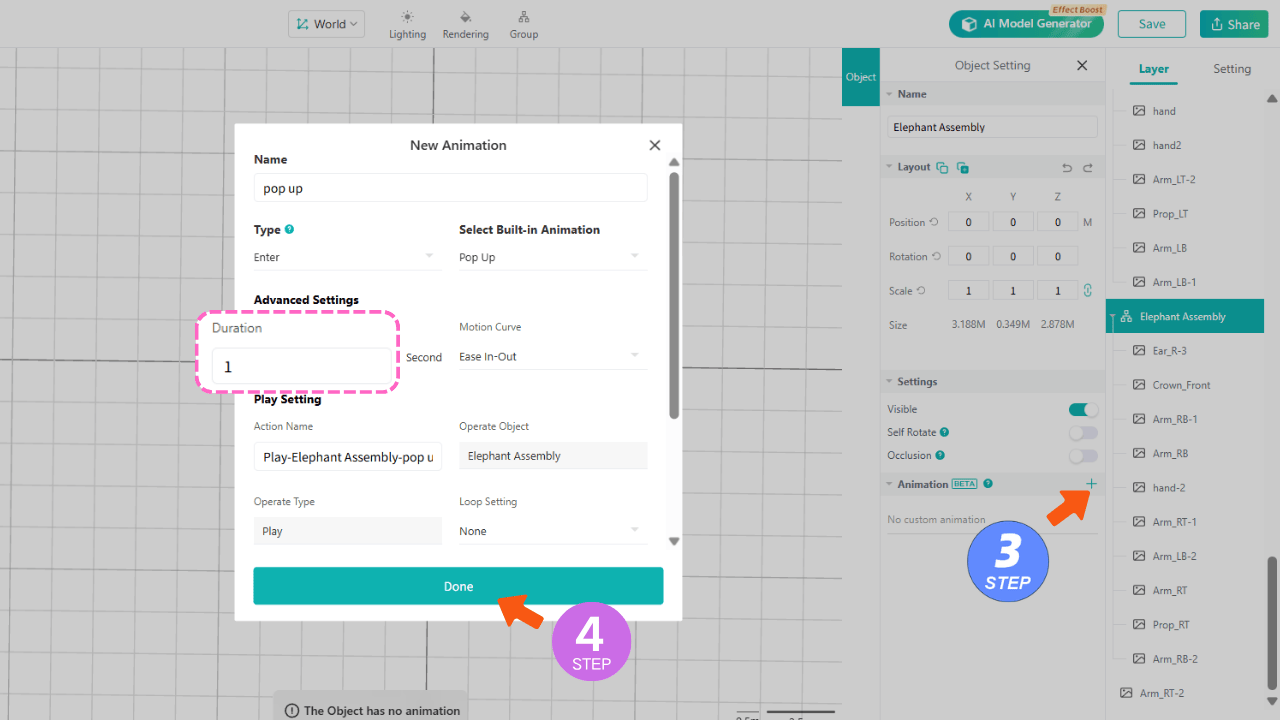 - Select all your materials and group them. Click the "Animation" button to add a pop-up animation no keyframes needed, just choose a preset and adjust the duration.