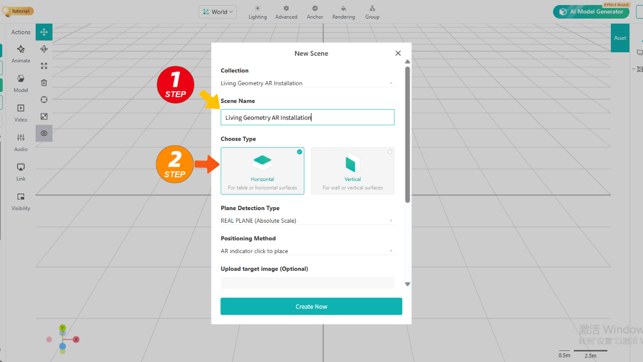 Name your scene, select Horizontal under Type, and you're ready to begin crafting your "Living Geometry AR Installation."